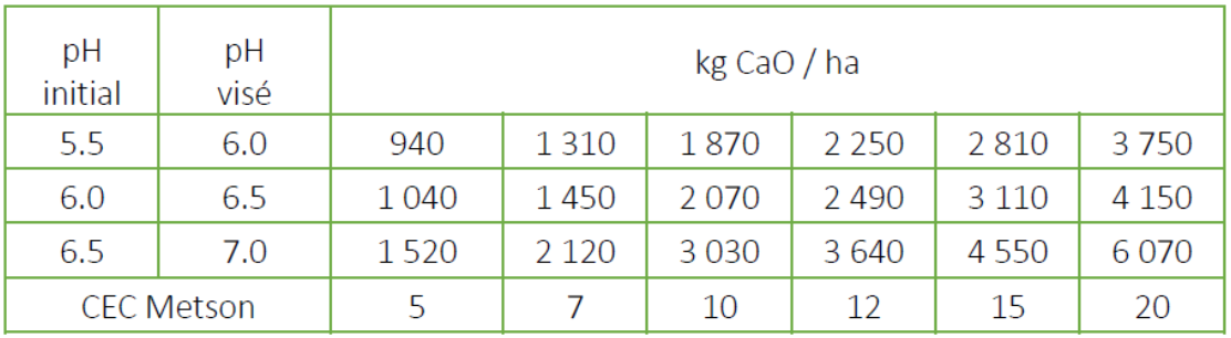 Le tableau suivant permet d’évaluer l’apport à l’hectare en CaO pour faire la correction: